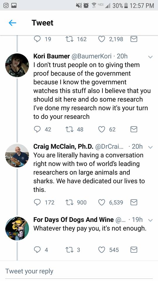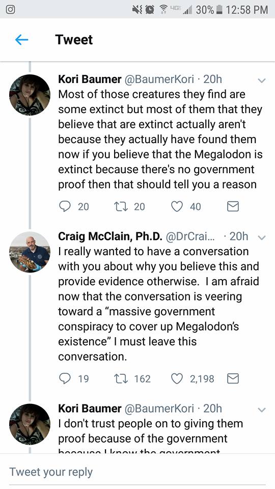 This is an example of what scientists have to deal with more and more lately. Craig McClain and David Shiffman are at the top of their fields (large marine life / sharks) and they still have to argue about the megalodon being extinct. Hint: the megalodon is as extinct as the giant ground sloth here in Florida. Aye carumba!